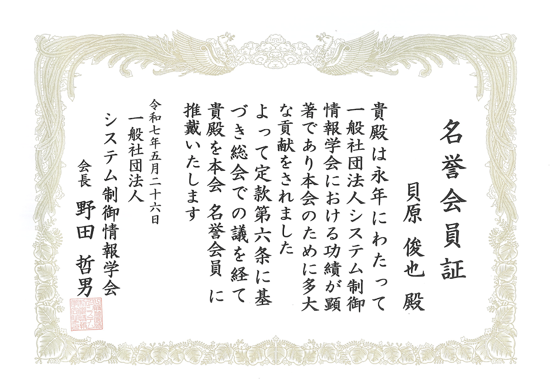 2025年5月26日 貝原先生がシステム制御情報学会の名誉会員に推戴されました.